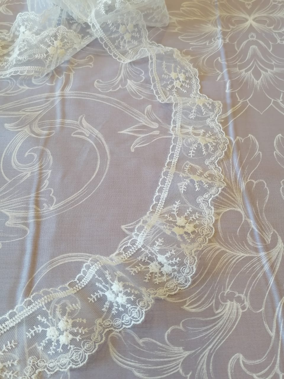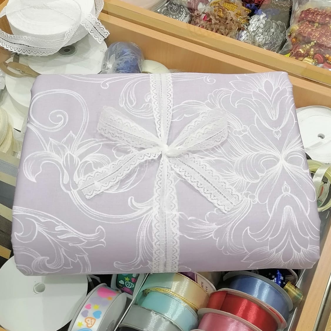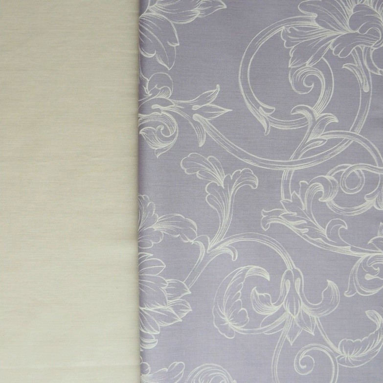 Аристократический оттенок светлой мальвы в сочетании с повторяющимся орнаментов нежных завитков, украсят вашу спальню.