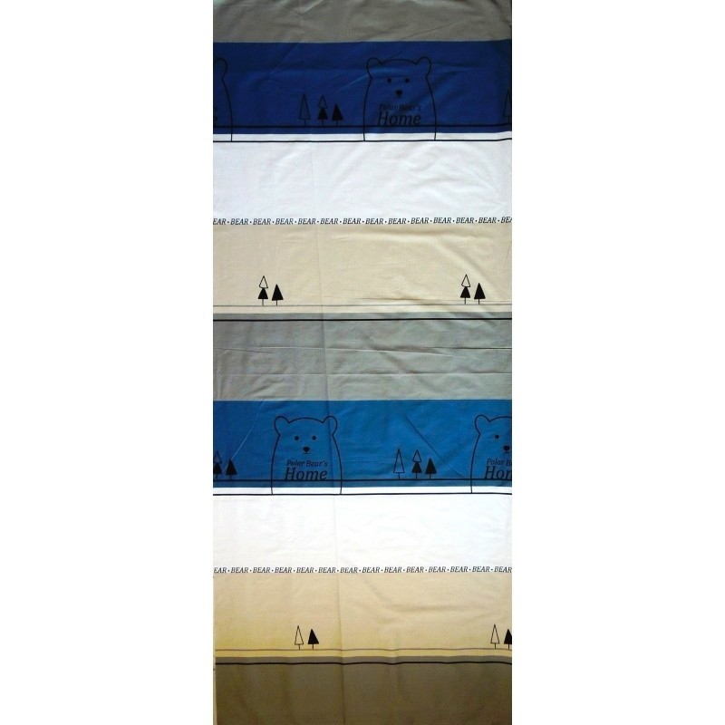 Стильная ткань расчерчена широкими двойными полосами бежево-коричневые, серо-голубые, синие. В каждой из которой живет своя тема мишек, елок и надписей.